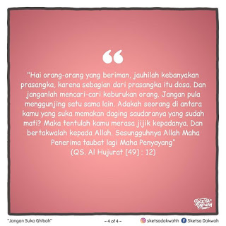 “Hai orang-orang yang beriman, jauhilah kebanyakan berprasangka, karena sesungguhnya sebagian tindakan berprasangka adalah dosa dan janganlah kamu mencari-cari kesalahan orang lain” (Al-Hujurat : 12)