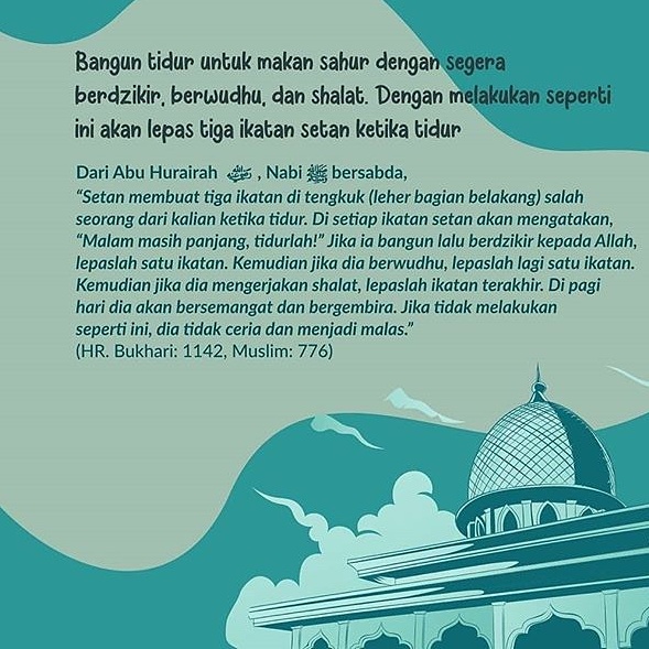 “Setan membuat tiga ikatan di tengkuk (leher bagian belakang) salah seorang dari kalian ketika tidur. Di setiap ikatan setan akan mengatakan, “Malam masih panjang, tidurlah!” Jika ia bangun lalu berdzikir kepada Allah, lepaslah satu ikatan. Kemudian jika dia berwudhu, lepaslah lagi satu ikatan. Kemudian jika dia mengerjakan shalat, lepaslah ikatan terakhir. Di pagi hari dia