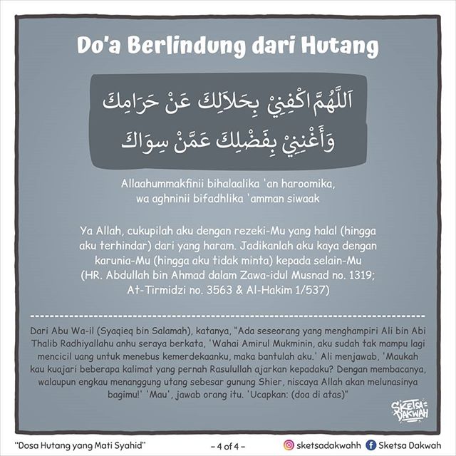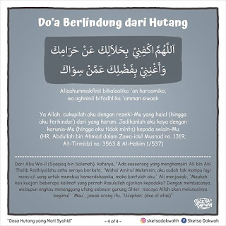 “Ya Allah, sesungguhnya aku berlindung kepada-Mu dari azab kubur, aku berlindung kepada-Mu dari fitnah Al Masih Ad Dajjal, aku berlindung kepada-Mu dari fitnah hidup dan fitnah mati. Ya Allah, aku berlindung kepada-Mu dari dosa dan hutang.” Kemudian ada seorang yang bertanya, “Alangkah seringnya engkau berlindung dari hutang.” Maka Beliau bersabda, “Sesungguhnya seseorang apabila berhutang, maka apabila berbicara berdusta, dan apabila berjanji mengingkari.” (HR. Bukhari)
