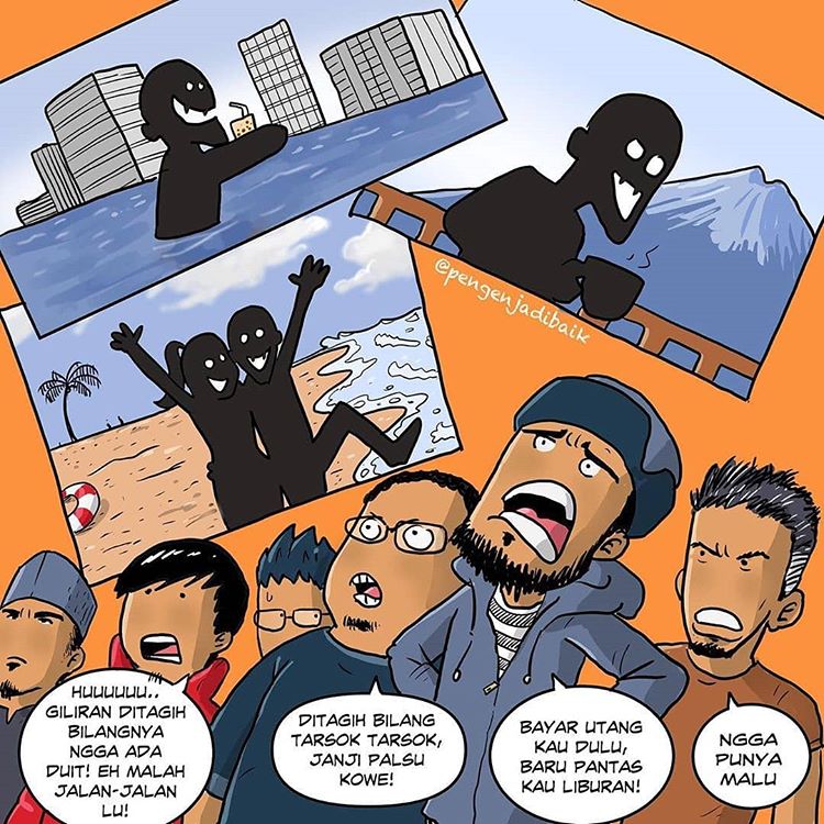 Beli barang2 baru. Jalan2 ke luar kota. Liburan berwisata. Dan itu semua dipamerkan di sosmednya (fb, instagram ataupun status whatsapp nya), sementara utangnya ngga dibayar. Padahal yang punya uang nunggu2 kapan utang akan dilunasi. Ketika ditagih malah mahluk jadi2an itu yang ngegas, marah2 dan kita yang diblock. Na’udzubillahi min dzaalik. Malah susah lho kalo nanti bayarnya di akhirat, sebab di sana ngga ada uang. “Halaaah duit receh aja pake ditagih!” katanya. Hati2 jangan karena uang receh malah jadi keburukan di akhirat nanti. Segera selesaikan urusan utang piutang kalian mumpung masih hidup di dunia.